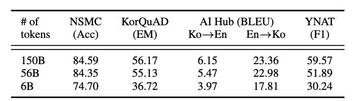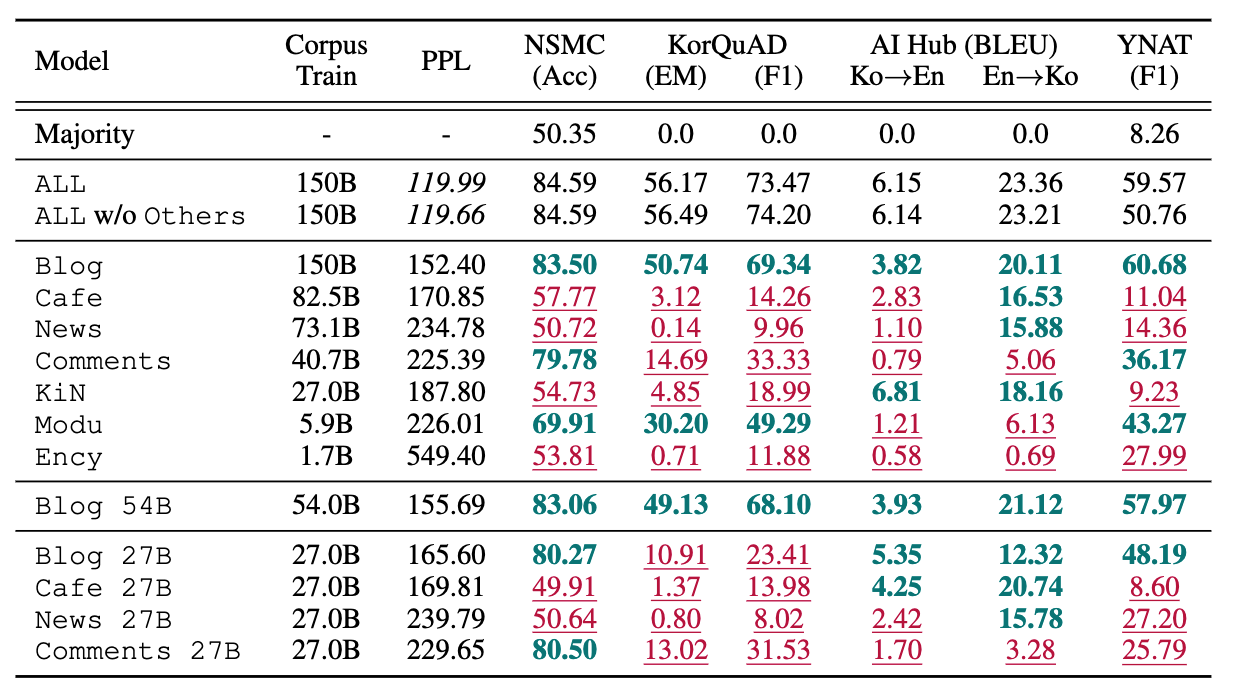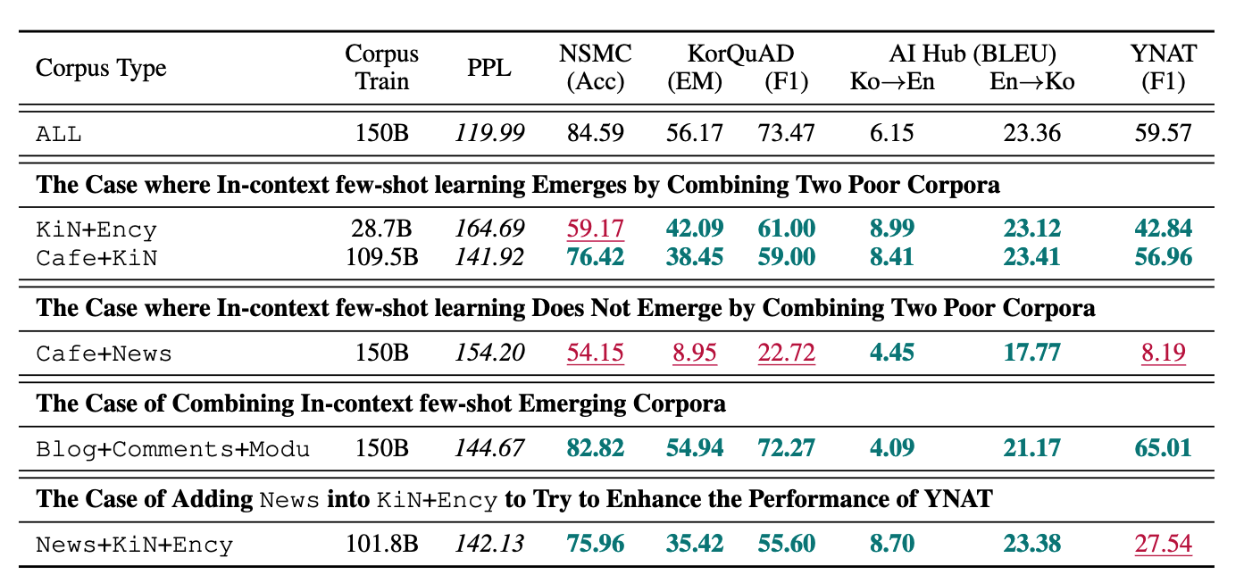 发现:比较不同单一语料库模型(如Blog、Cafe、News)的性能,上下文学习能力高度依赖于语料库的领域来源。比如,Blog 54B